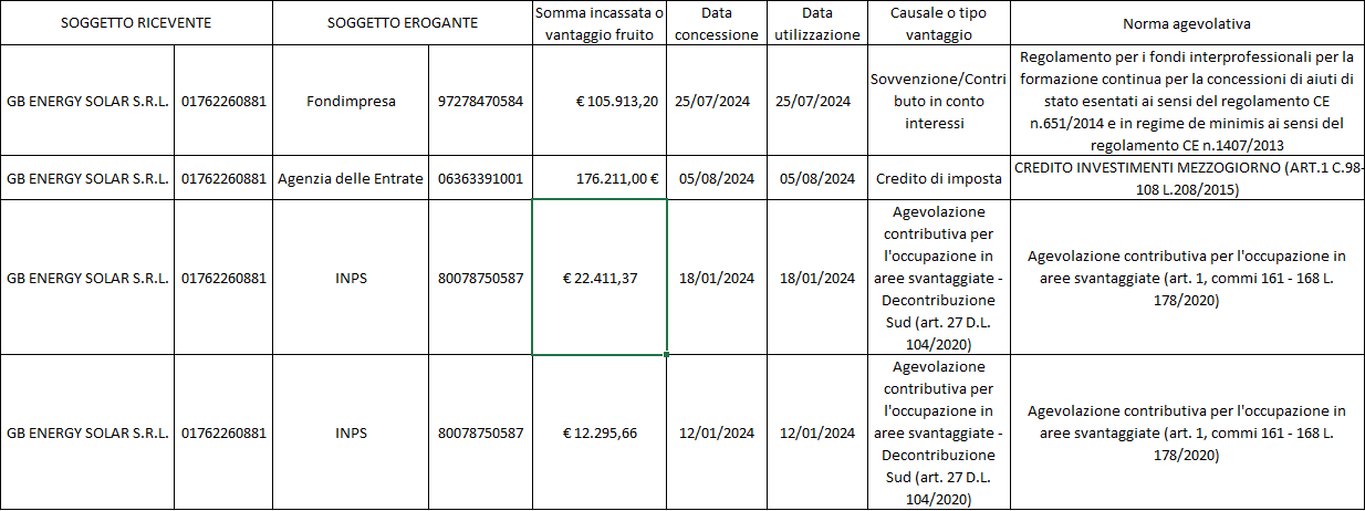 La società, adempiendo all’obbligo introdotto con la L. 124/2017 e ss.mm.ii., che richiedeva la pubblicazione, entro il 30 giugno di ogni anno, sul proprio sito internet aziendale, dell’elenco completo e dettagliato degli aiuti e contributi pubblici ricevuti nell’esercizio dell’attività di impresa nel corso dell’anno precedente, se di importo complessivo superiore a 10.000 euro, si dettaglia quanto segue: premendo sul pulsante scarica Tabella, si potranno vedere in modo analitico tutti gli aiuti ricevuti.